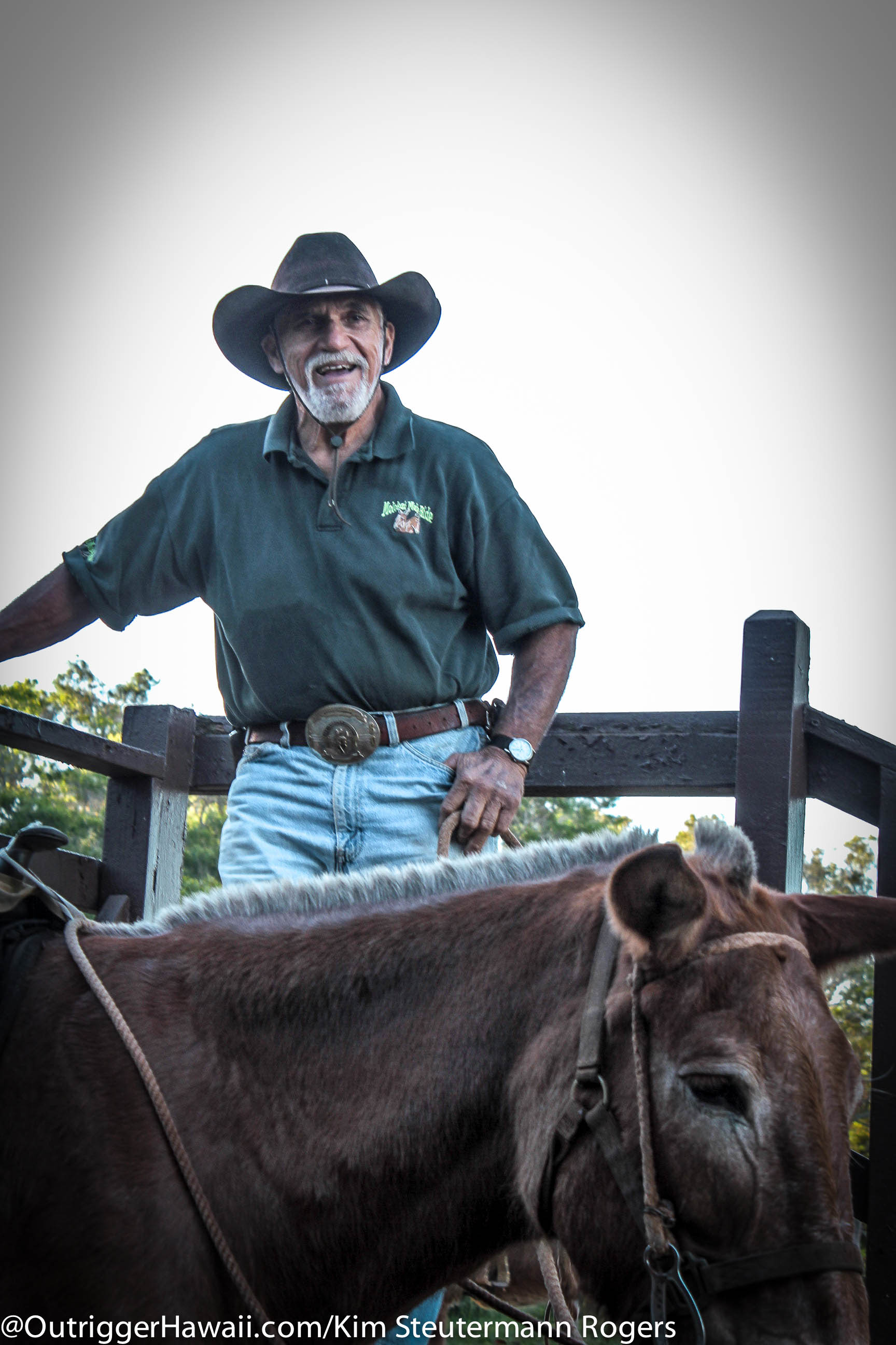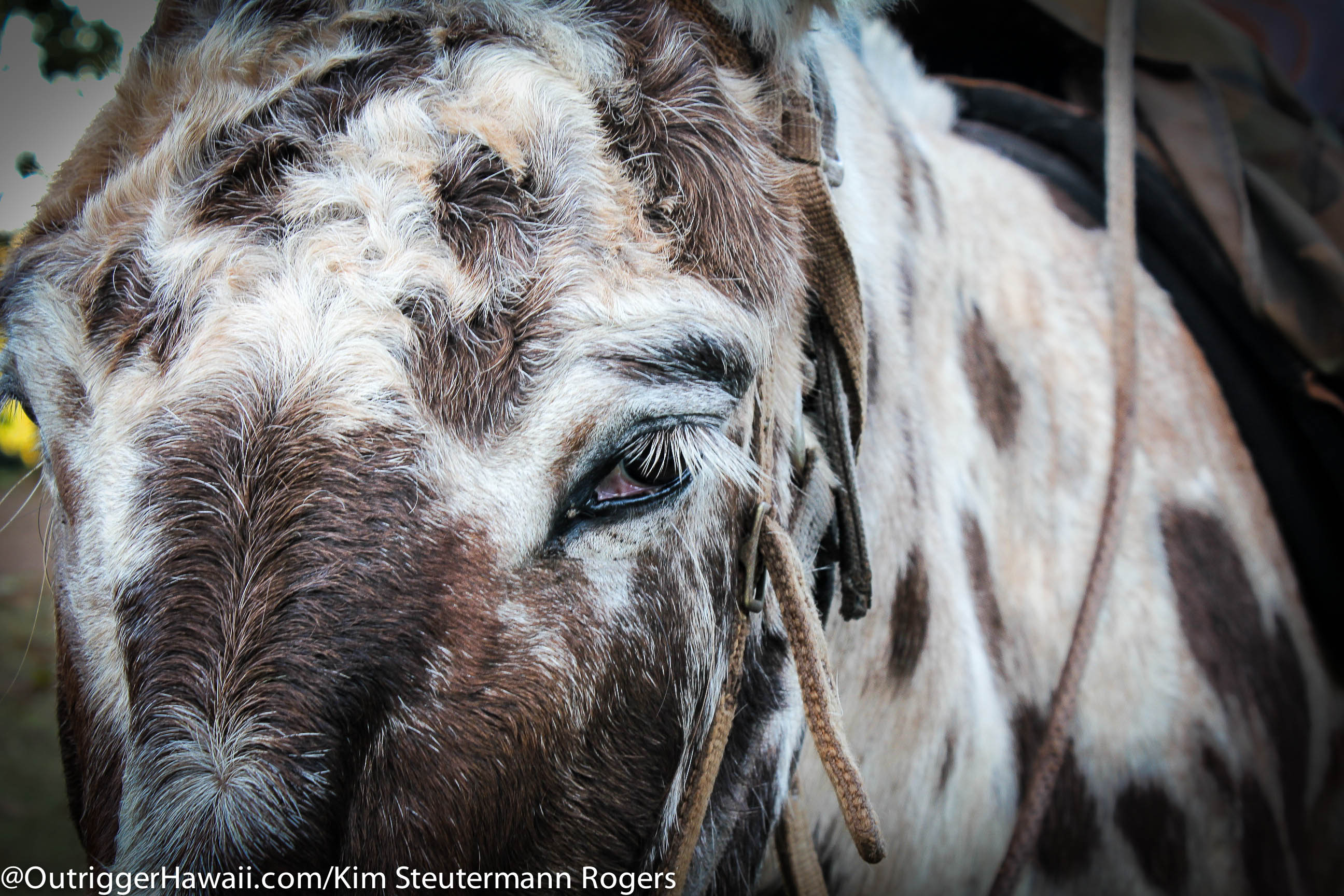 “All the mules have a name,” Buzzy said. “And we want you to remember that name, because we cannot remember your names but we sure know your mule’s name. Some of these mules have Hawaiian names. This mule’s name is Makani. It means ‘wind’ in Hawaiian. Not because he goes like the wind but whoever rides in the back of him will know why we named him Makani.”