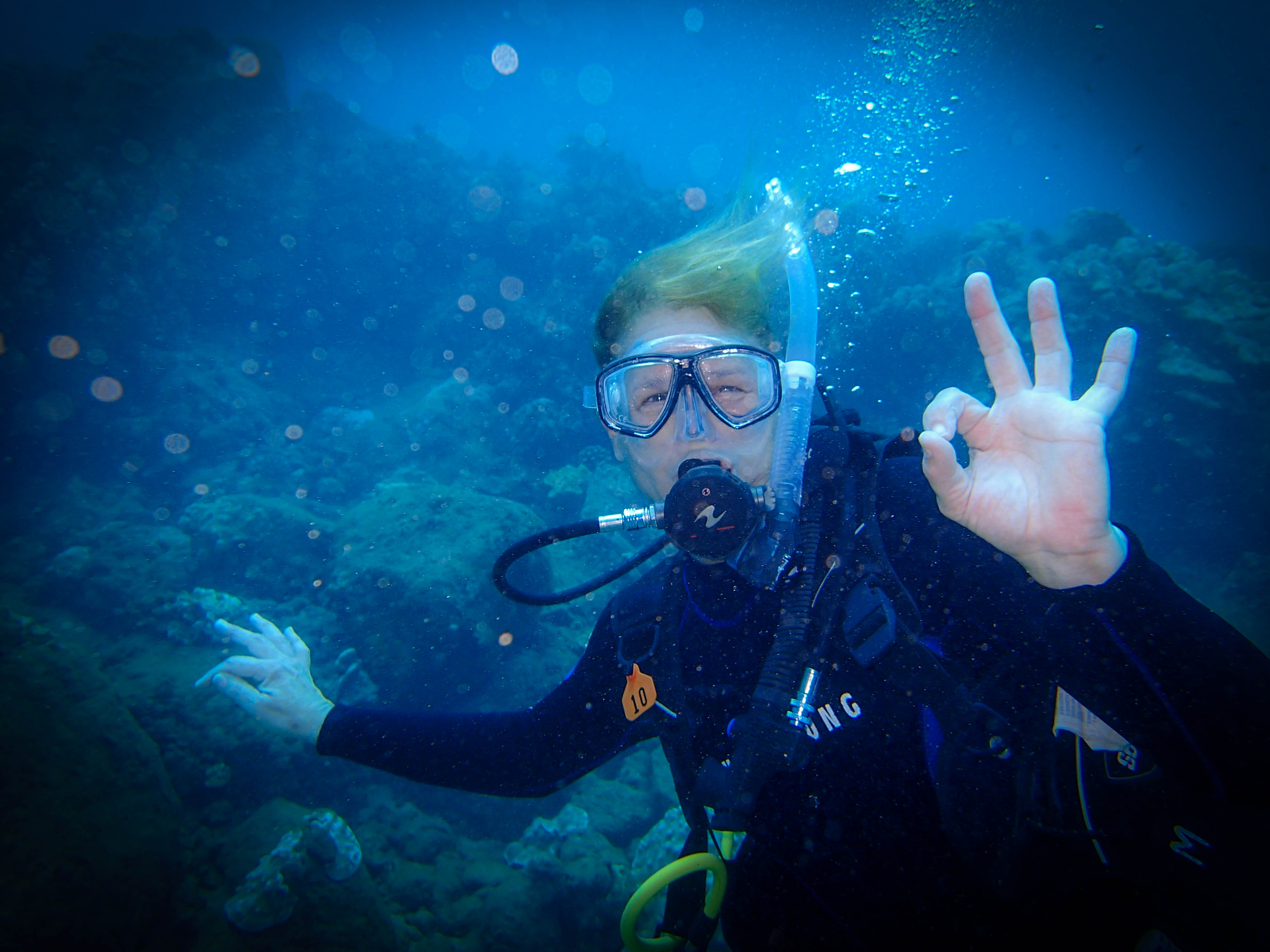 Tommye’s very first underwater wildlife encounter involved a green sea turtle. “It came right up to us on our descent line,” she said after her first boat dive. “It was huge.”